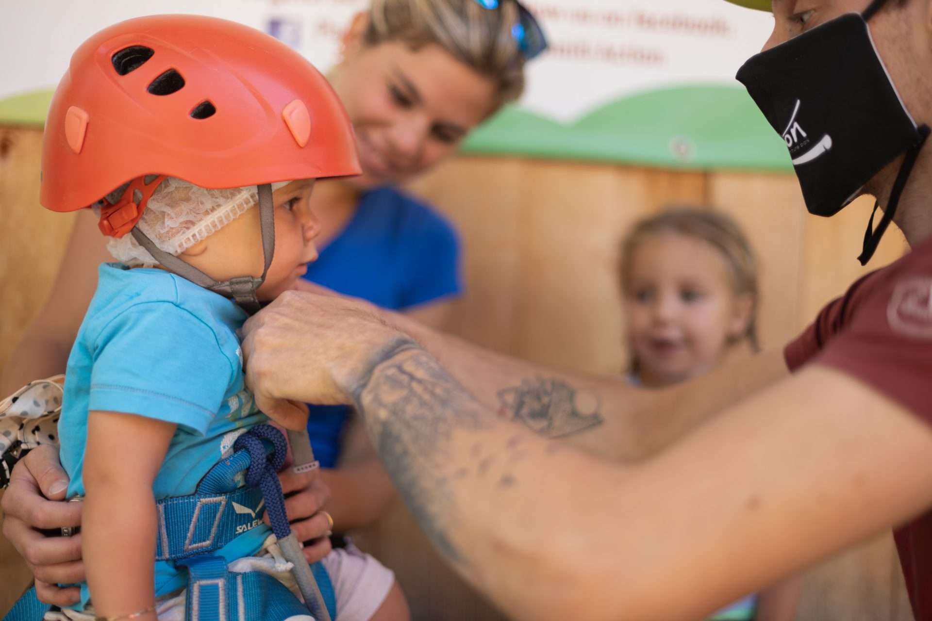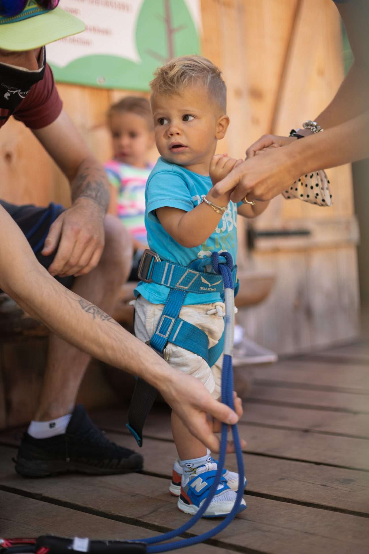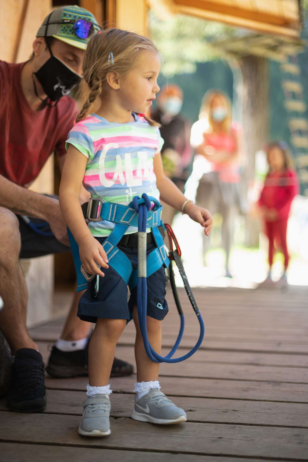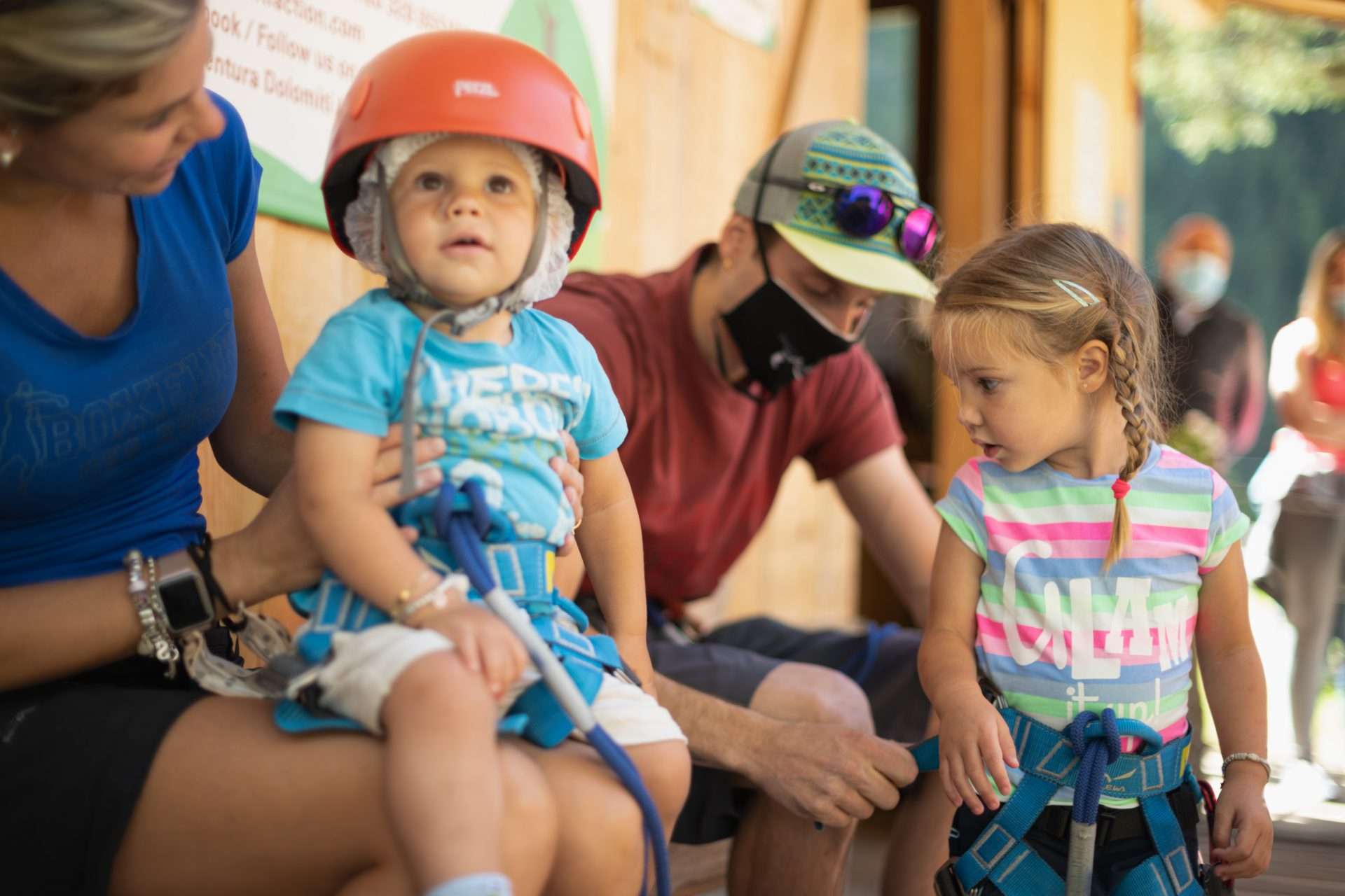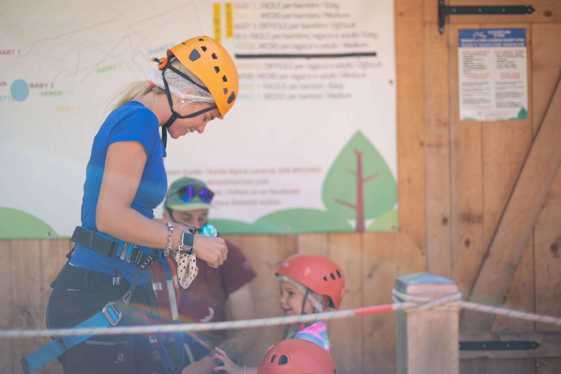 Viene fornito il set di sicurezza: casco, imbrago, doppia corda con moschettoni e carrucola.